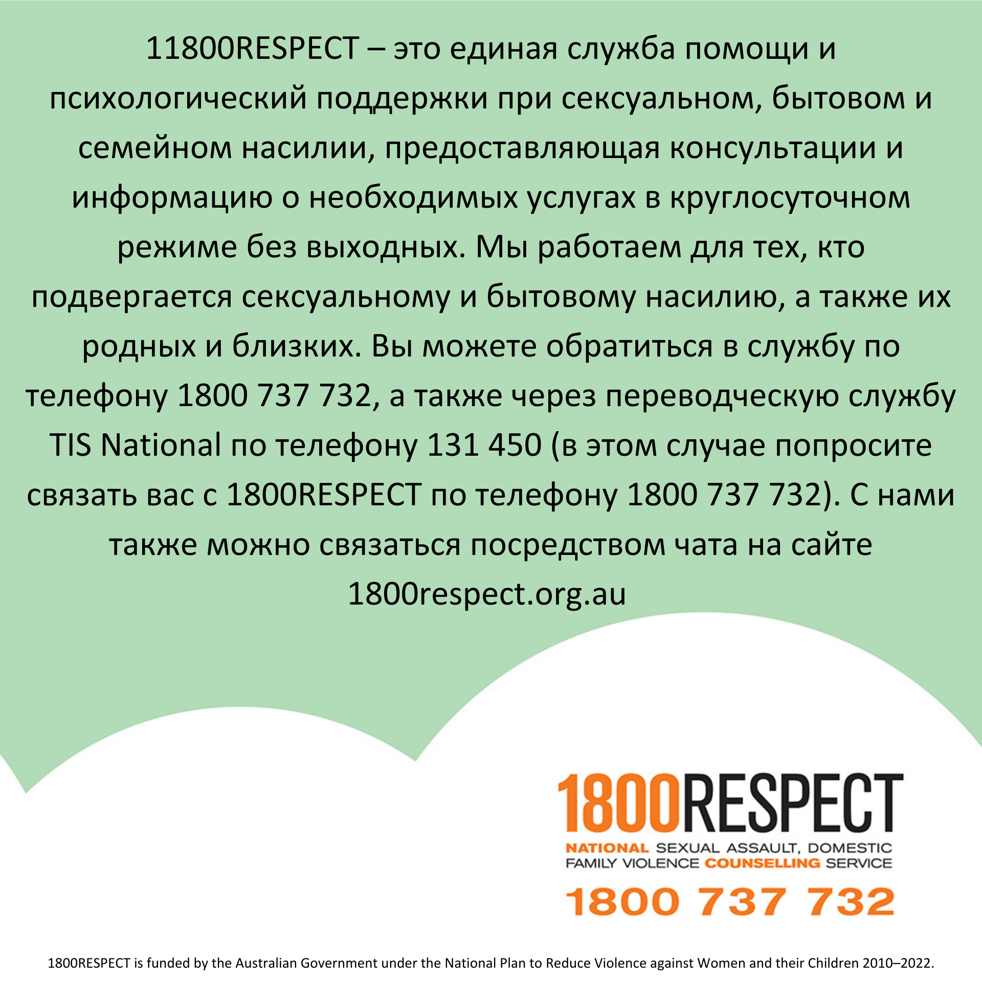 1800RESPECT is the national domestic, family and sexual violence counselling, information and support service. If you or someone you know is experiencing, or at risk of experiencing, domestic, family or sexual violence, you can call 1800RESPECT on 1800 737 732, text 0458 737 732 or visit their website for online chat and video call services - Available 24/7.